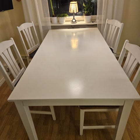 IKEA matgrupp bestående av runt matbord och flera stolar. Bordet är vitt med fyra ben och rund bordsskiva. Stolarna är vita med hög rygg och sits med mörkblå klädsel. Passar som matplats i kök eller vardagsrum. Formgivare: Bonderup & Thorup.