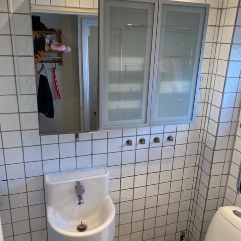 Det är glasdörr med spegel på både fram och baksidan, samt 2 glashyllor.