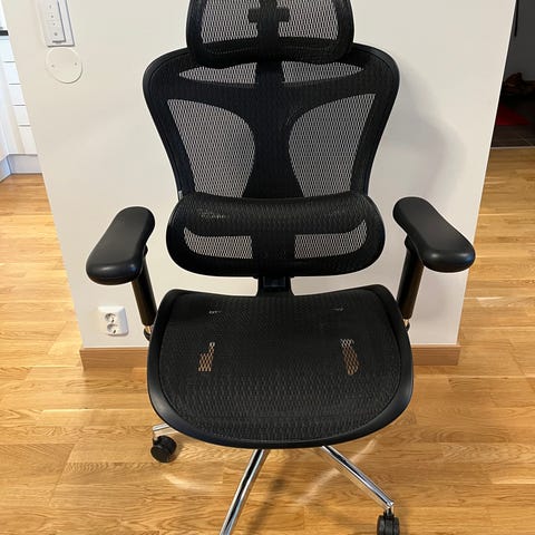 En helt ny kontorsstol nyligen köpt på Jysk. Stolens mått är uppskattade. Det är en helt vanlig kontorsstol med vad det innebär. Ventilerad modell som inte är lika varm att sitta på.