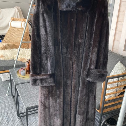 Saga Mink pälsjacka för dam i storlek M. Jackan är brun och har en längre modell med krage. Yttermaterialet är minkpäls och insidan är fodrad. Knäppning framtill med dekorativa knappar. Passar som ytterplagg vid kallare väder.