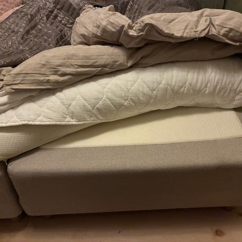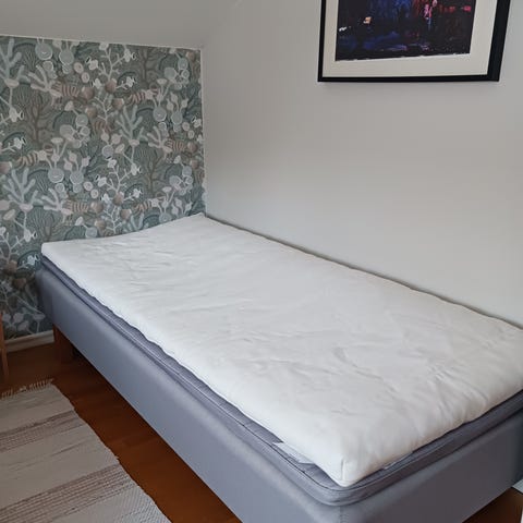 IKEA Skårer resårbotten i gråbeige tyg. Skråer är en äldre modell, inköpt för ca 3 år sedan. Varsamt använd, alltid med madrassskydd. Två resårstommar, varav en är klädd i Bouclé textil för att agera som dagbädd. Ben medföljer till båda stommarna. Passar som enkelsäng i sovrum, gästrum eller som dagbädd. De skapar tillsammans en 160 cm bred säng.