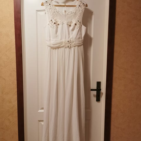 By Malina klänning för dam i storlek XL. Klänningen är vit och har en asymmetrisk axel med en kort puffärm i transparent tyg. Nederdelen består av flera lager med lätt rynkad kjol som ger en volangliknande effekt. Passar exempelvis till fest eller andra mer uppklädda tillfällen.