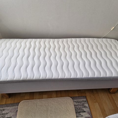 IKEA säng med grå sängram och enkel bäddmadrass. Sängen står på metallben. Passar som enkelsäng i sovrum, gästrum eller studentrum. Bäddmadrass ingår enligt bild.