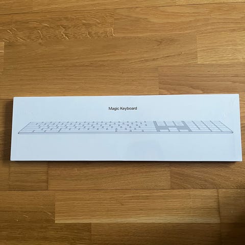 Apple trådlöst tangentbord i fullstorlek med numerisk del. Tangentbordet är vitt med lågprofilstangenter och kompakt design. Passar för användning med datorer och andra kompatibla enheter som stöder trådlösa Apple-tangentbord.