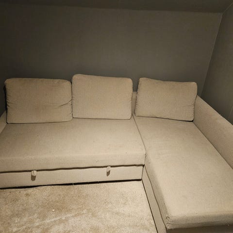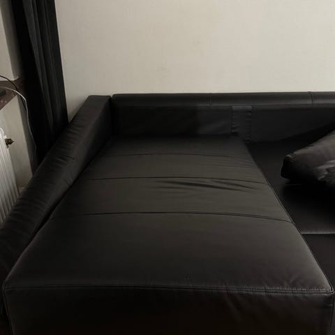 Bäddsoffan är i svart skinn och väldigt enkel att bädda i.