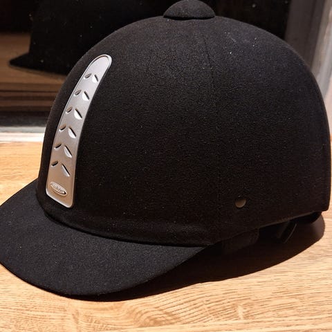 Kask ridhjälm i marinblått med dekor i form av svensk flagga på ovansidan. Hjälmen har skärm framtill och justerbart hakband med vadderad insida för ökad komfort. Passar för ridning och annan hästsport där god huvudskyddsutrustning krävs.