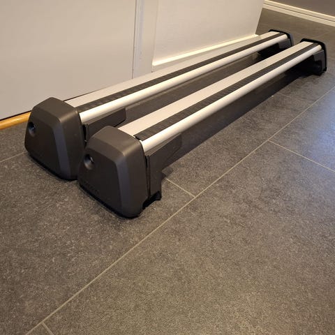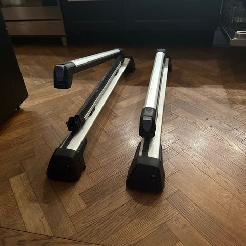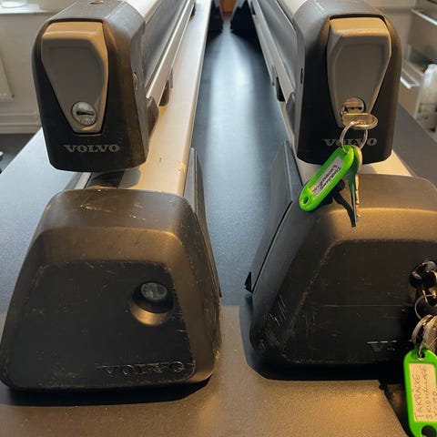 Volvo takräcke i aluminium med svarta plastfästen och lås. Passar som lastsystem på bilens tak för exempelvis takbox eller annan last, anpassat för bilmodeller med kompatibla infästningar från Volvo. Två lasthållare ingår enligt bild.