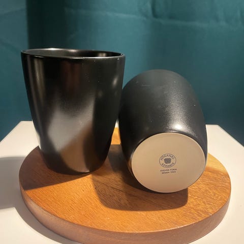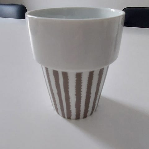 En kaffemugg från Rörstrand i serien Filippa K med mönstret "Pinstripes”