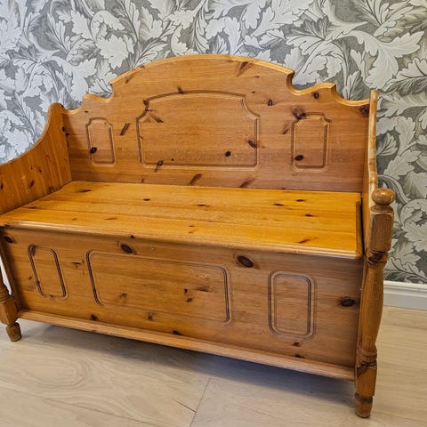 Blå sängsoffa i trä med spjälrygg och armstöd. Sitsen har en blommönstrad dyna i flera färger. Under sitsen finns inbyggda förvaringslådor med knoppar. Passar som sittmöbel och extrasäng i exempelvis vardagsrum, hall eller gästrum.