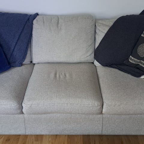 Soffgrupp bestående av en 2-sits och en 3-sits soffa i ljusgrått tyg. Båda sofforna har raka linjer, breda armstöd och lösa rygg- och sittdynor. Passar som sittgrupp i vardagsrum eller allrum. Färg och utförande gör dem enkla att kombinera med olika soffbord och inredningsstilar.