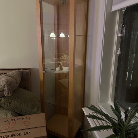 Hej! Säljer glasskåp med 3 glashyllor + bottenplanet.