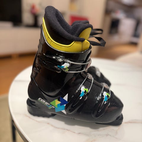Skidpjäxor för barn med storlek 21,5 eller innermått 255 mm. Ytterskal i svart plast med rosa och vita detaljer. Fyra spännen framtill för justerbar passform. Mjuk, vadderad innersko i textil för ökad komfort. Passar till alpin skidåkning för barn.