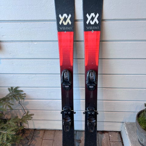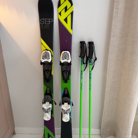 Twintip-skidor 128 cm långa. Lite repiga på ovansidan och behöver vallas, men har fungerat bra att åka på.