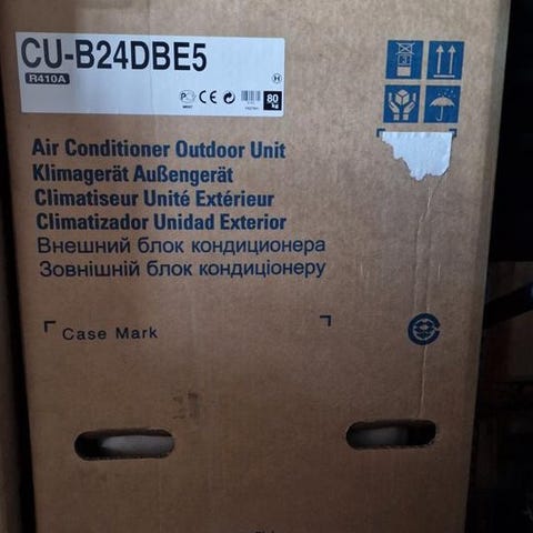 Nippon Eco Powerful luftvärmepump. Paketet innehåller innedel, utedel och fjärrkontroll enligt bilderna. Luftvärmepumpen är avsedd för fast installation och kan användas för uppvärmning och kylning av inomhusmiljö. Märkning och tekniska symboler på kartongen visar att produkten är anpassad för europeisk standard med CE-märkning. För exakta tekniska data som effekt, kapacitet och energiklass hänvisas till tillverkarens manual eller produktspecifikation.