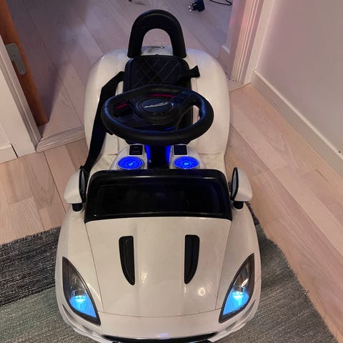 Fin elektrisk bil för barn med extraljus ramp, väska, gasreglage samt fram och bakväxel.