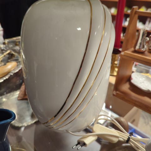Bordslampa i vitt glas med veckad lampskärm