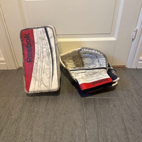 Barn målvaktsset. Setet består av benskydd Bauer prodigy, plock och stöt från CCM. Benskydd storlek L 24+ ,stöt och plock storlek youth reg.