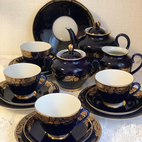 Art Deco mockakopp i marinblått porslin med förgylld insida. Crown Devon, England, 1930-tal.