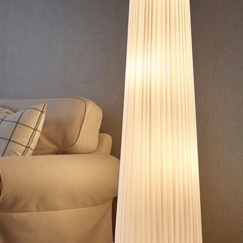 Golvlampa KROBY från IKEA. Lampan har en stomme i metall och en vit glasskärm. Den har en strömbrytare på sladden.