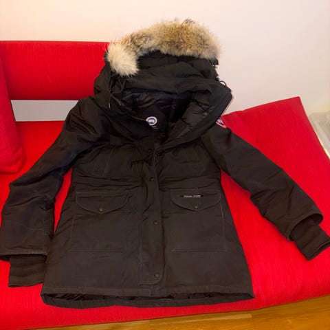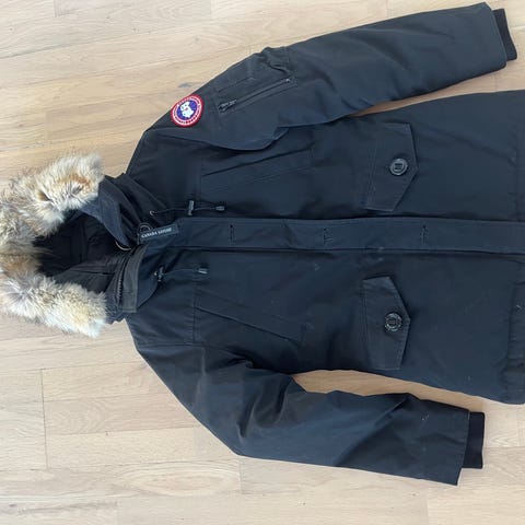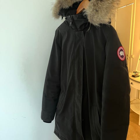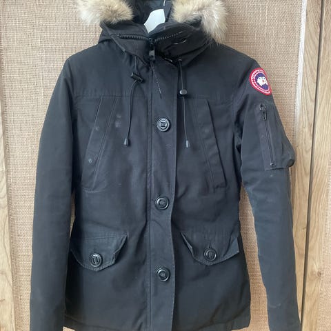 Canada Goose jacka för dam i storlek XS. Jackan är svart och har huva med pälskant. Modellen är ett varmt ytterplagg med dragkedja och knappar framtill, flera ytterfickor samt klassiskt Canada Goose-märke på ärmen. Passar som övrigt ytterplagg för kallare väder.Det är en äldre modell och den är fortfarande jätte fin.
