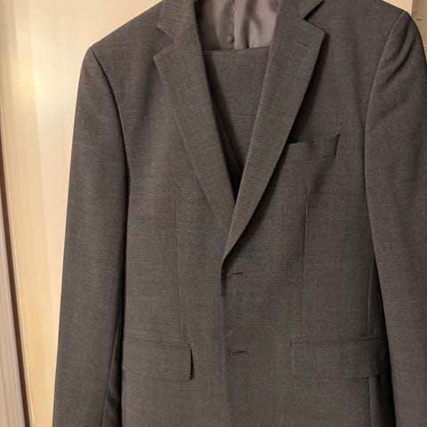 A BATHING APE kostym för herr i storlek M. Tvådelad kostym med kavaj och byxa i grå färg, tillverkad i akrylmaterial. Kavajen har knäppning framtill och framfickor, byxan har bälteöglor och raka ben. Passar för formella tillfällen, arbete eller fest.
