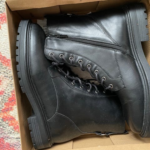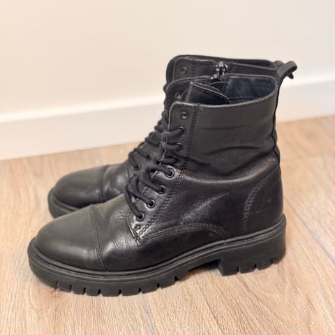 vinterskor i form av svarta kängor i storlek 40. Modellen har snörning framtill och dragkedja på sidan för enklare av- och påtagning. Grov yttersula i gummi för bättre grepp. Passar som vardagsskor under kallare säsong.