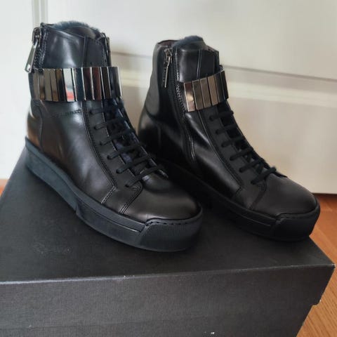 Acne Studios sneakers i svart skinn i storlek 35. Skorna har snörning framtill och en ljus, något upphöjd yttersula. Ovandel i slätt läder med Acne Studios-logotyp på sidan. Passar som vardagsskor eller för enklare fritidsbruk.