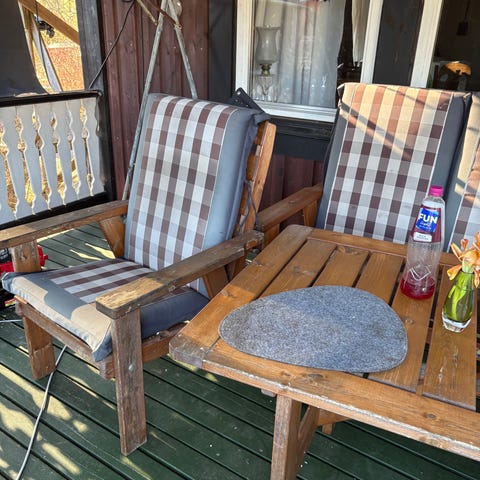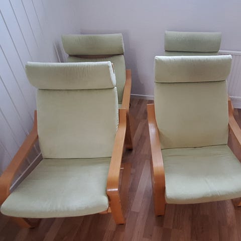 En grupp bestående av stol, bord, fotälj, fotpall och sypuff.