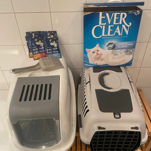Curver kattlåda med tak i vit plast. Modellen har utdragbar bottenlåda för enkel rengöring och en perforerad matta vid ingången som hjälper till att fånga upp kattsand från tassarna.