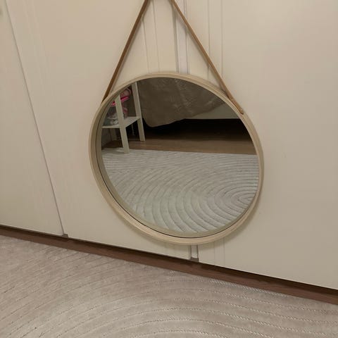 Hemtex rund spegel med svart ram. Spegeln har en tunn, rund metallram i svart och upphängningsfästen på baksidan för montering på vägg. Jättefint skick. 70x70cm