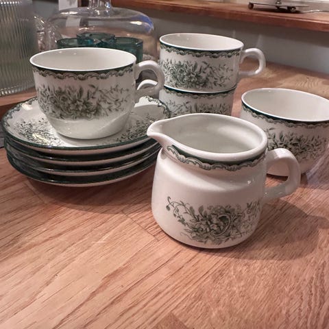 Gustavsberg Tahiti ( Stig Lindberg) kaffekoppar med fat i porslin. Dekor med flerfärgade blommotiv på vit botten och grön innerkant på faten. Setet består av 10st koppar och 12st matchande fat, 12 assietter och en sockerskål. Allt i mycket fint skick förutom en kopp som har en liten skavank.