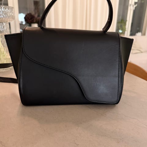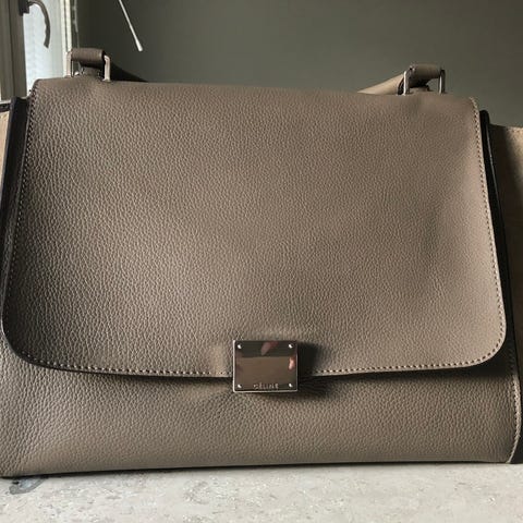 Celine handväska för i ljusbeigt läder. Väskan har två korta handtag upptill samt en längre axelrem för bärning över axeln eller korsvis. Utsidan är tillverkad i slätt och lätt strukturerat läder. Insidan är ofodrad med mocka yta och har en innerficka med dragkedja för mindre föremål. Väskan stängs med rem och spänne upptill. Passar för vardagsbruk, storlek 24cm bredd 25cm höjd. Pga den ljusa mockan kan man se väl användning inuti väskan.