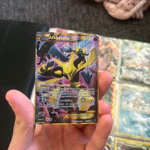 Pokémon samlarkort EX. Motivet på framsidan visar ett färgstarkt Pokémon-kort, och baksidan har den klassiska blå Pokémon-designen med pokéboll. Kortet förvaras i en samlarpärm tillsammans med andra Pokémon-kort. Passar för samling eller spel i Pokémon Trading Card Game (TCG).