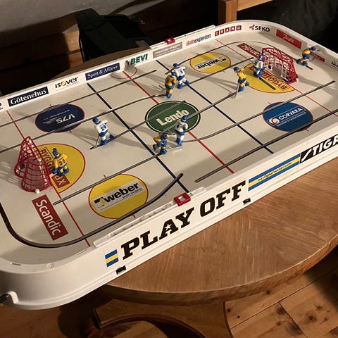 Bordshockeyspel i orginalkartong, lite reservdelar följer med, extra spelare, stänger mm, en liten spricka i ytskiktet/”isen”, se bilder. Skickas inte.