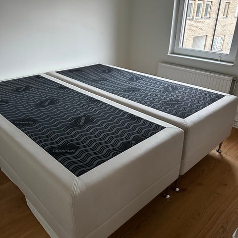 Metallben ger stabilitet och höjd från golvet. Passar som dubbelsäng eller två enkelsängar beroende på behov. Överdrag i mörk textil med handtag på sidorna för enklare hantering.