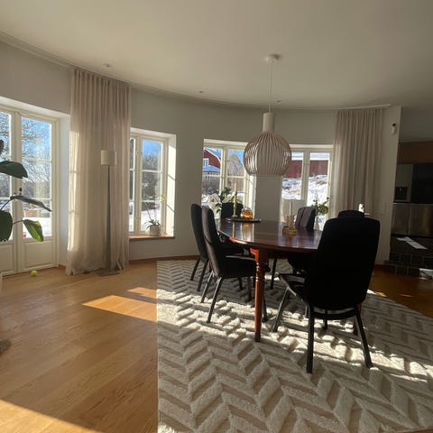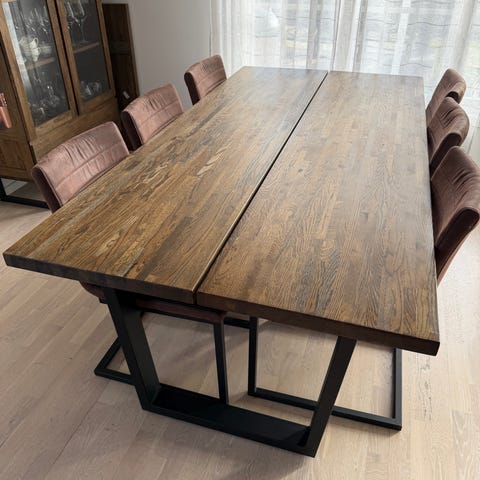 Bordet är 140 cm långt och har iläggsskiva som gör det 180 cm, perfekt när man får gäster.