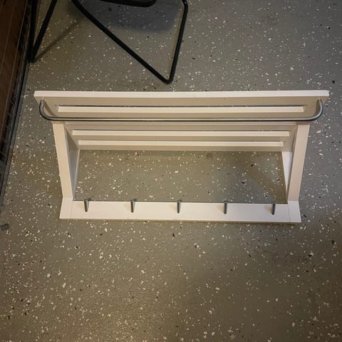 Hatthyllan är 65 cm bred, 29 cm djup och 25 cm hög. Skenan som fäster hyllan mot väggen är 31 cm hög. Långa skruvar medföljer