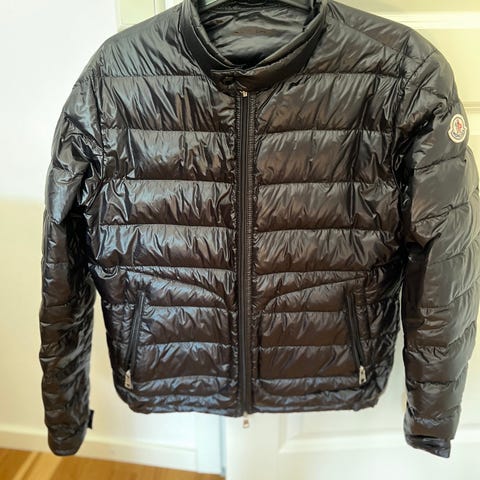 Två framfickor med dragkedja. Moncler-logotyp på ärmen och Moncler-märke på insidan. Passar som lättare ytterjacka i kallare väder.