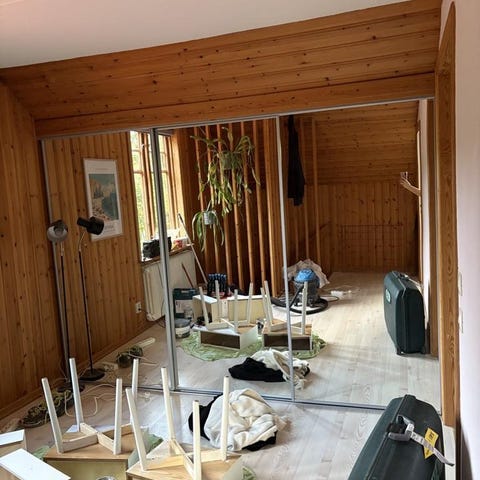 Skjutdörrarna har en vit stålram med 8 mm fyllning i vit melaminbelagd spånskiva. Jag har inte tagit bort skyddstejpen.