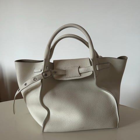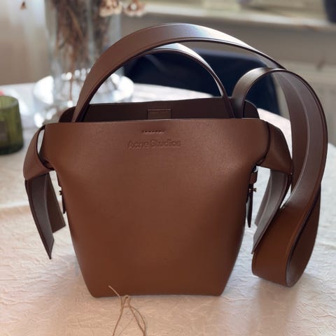 Celine skinnväska i läder. Väskan har en bucket-inspirerad form med ett stadigt bärhandtag och justerbar remdetalj framtill. Tillverkad i slätt läder i en brun/cognacfärgad ton. Passar för vardagsbruk med plats för mindre personliga tillhörigheter. Den har ett mindre märke på framsidan men inuti har den inget att anmärka på. Kvitto finns tillhörande och serienummer.