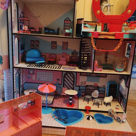 L.O.L. Surprise husbil lekset i blått och rosa plast. Leksetet består av en lastbil med avtagbar husvagn som kan fällas ut till en spelvärld med flera olika lekområden. Insidan har sittplatser, bord, scen och mindre inredningsdetaljer. På bilderna syns flera L.O.L.-dockor och småfigurer som kan användas tillsammans med husbilen. Passar för barn som gillar rollekar med dockor och fordon.