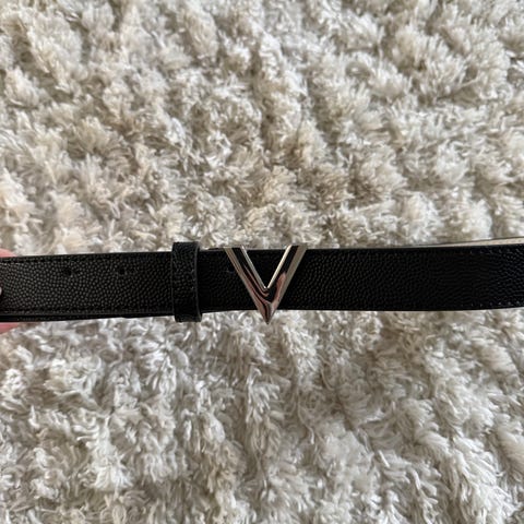 Valentino bälte för kvinna i rött läder. Bältet har guldfärgat metallspänne med dekorativ logodetalj. Justerbar längd med flera hål. Levereras med tillhörande tygpåse och ask enligt bild. Storlek 75. Helt nytt, aldrig använt.