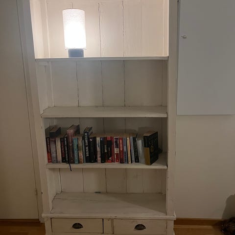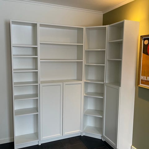 Två hyllor med övre hyllplan, lådor och skjutdörrar med hyllplan bakom.