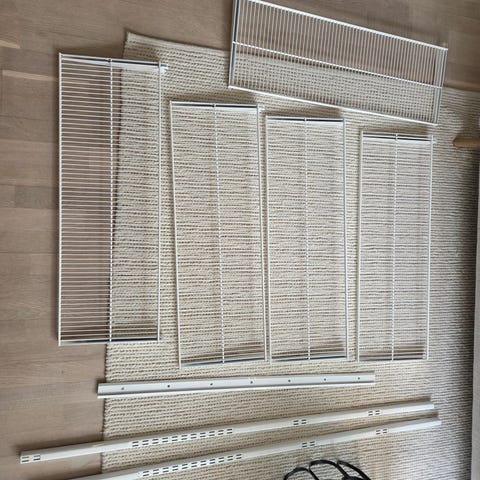 ELFA hyllplan 6 st på 100 cm med en bredd på 20 cm , 6 st hängskenor H: 70 cm och 12 konsoler.