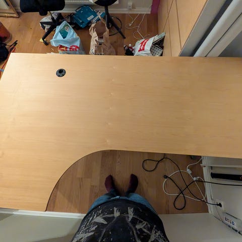 IKEA-skrivbord med avtagbar hylla och justerbara ben.