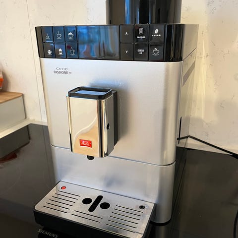 Melitta kaffemaskin i svart utförande. Maskinen har inbyggd kvarn för hela bönor och frontpanel med knappar för val av dryck och inställningar. Utlopp för kaffe är placerat framtill med droppbricka under. Tillbehör som manual, skötselmaterial och eventuellt tamp-/rengöringsverktyg syns på bilden. Passar för bryggning av olika kaffedrycker i hem- eller kontorsmiljö.