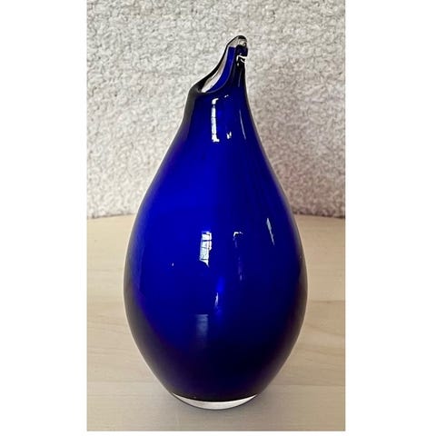 Vasen är 20 cm hög och uppbyggd i kraftiga lager av färgat och klart glas, där de djupa tonerna av blått och grönt flyter samman i ett hypnotiskt färgspel.