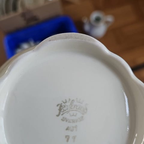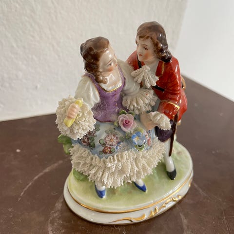 Wallendorf porslinsfigurer dansande flickor i vita klänningar. Setet består av två figurer, en stående på rund fot och en knästående. Båda figurerna är märkta undertill med Wallendorfs stämpel och modellnummer. Passar som prydnad i exempelvis vardagsrum, vitrinskåp eller samling av porslinsfigurer.