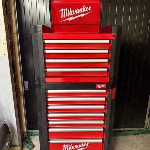 Milwaukee Packout är en verktygslåda på terränghjul konstruerad med slagtåliga polymerer för hållbarhet på arbetsplatsen. Det starka, utdragbara handtaget klarar en vikt på upp till 113 kg.