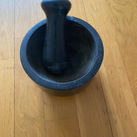 Mortel i grå marmor från IKEA. Diameter 14 cm, höjd 9,5 cm.